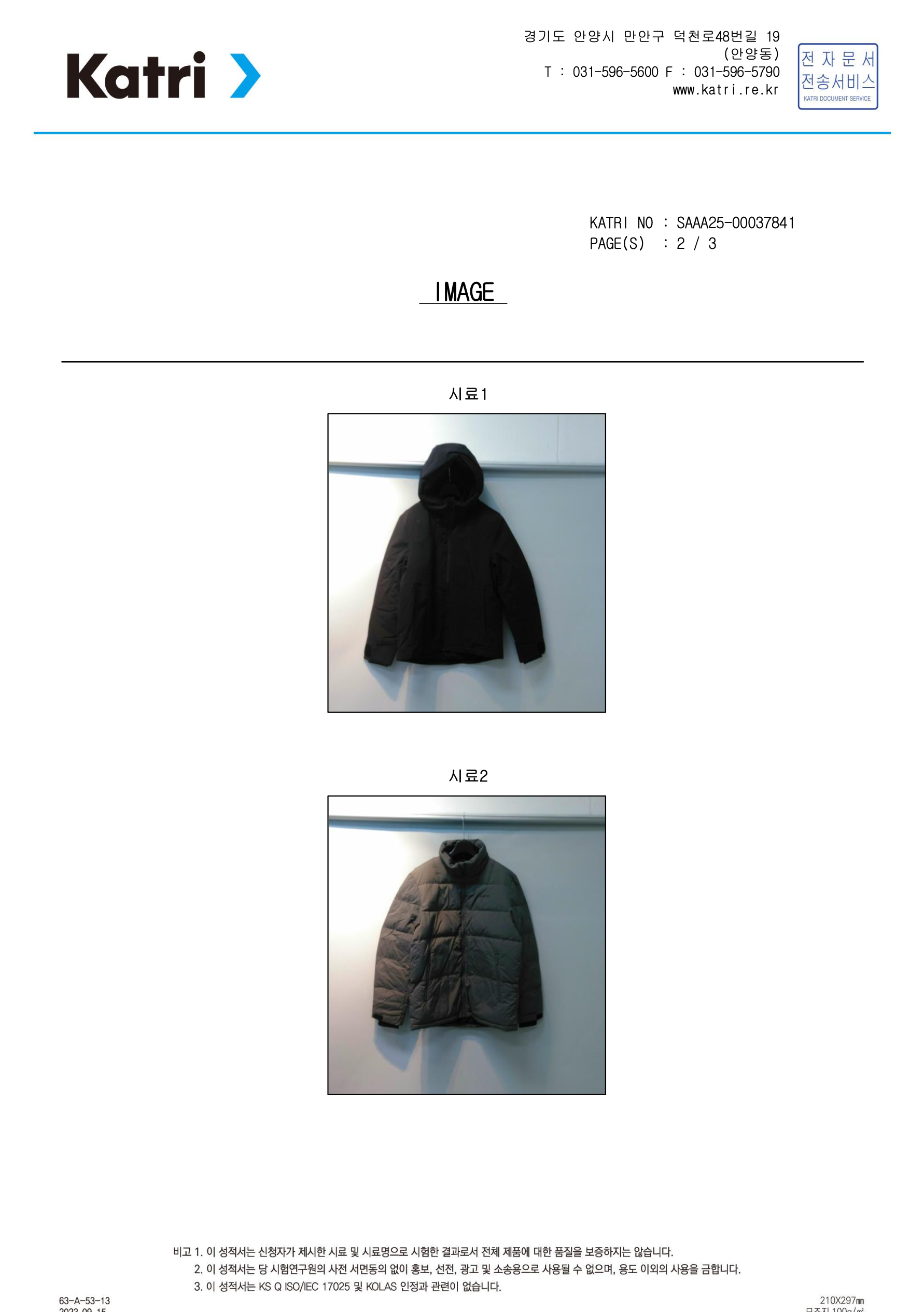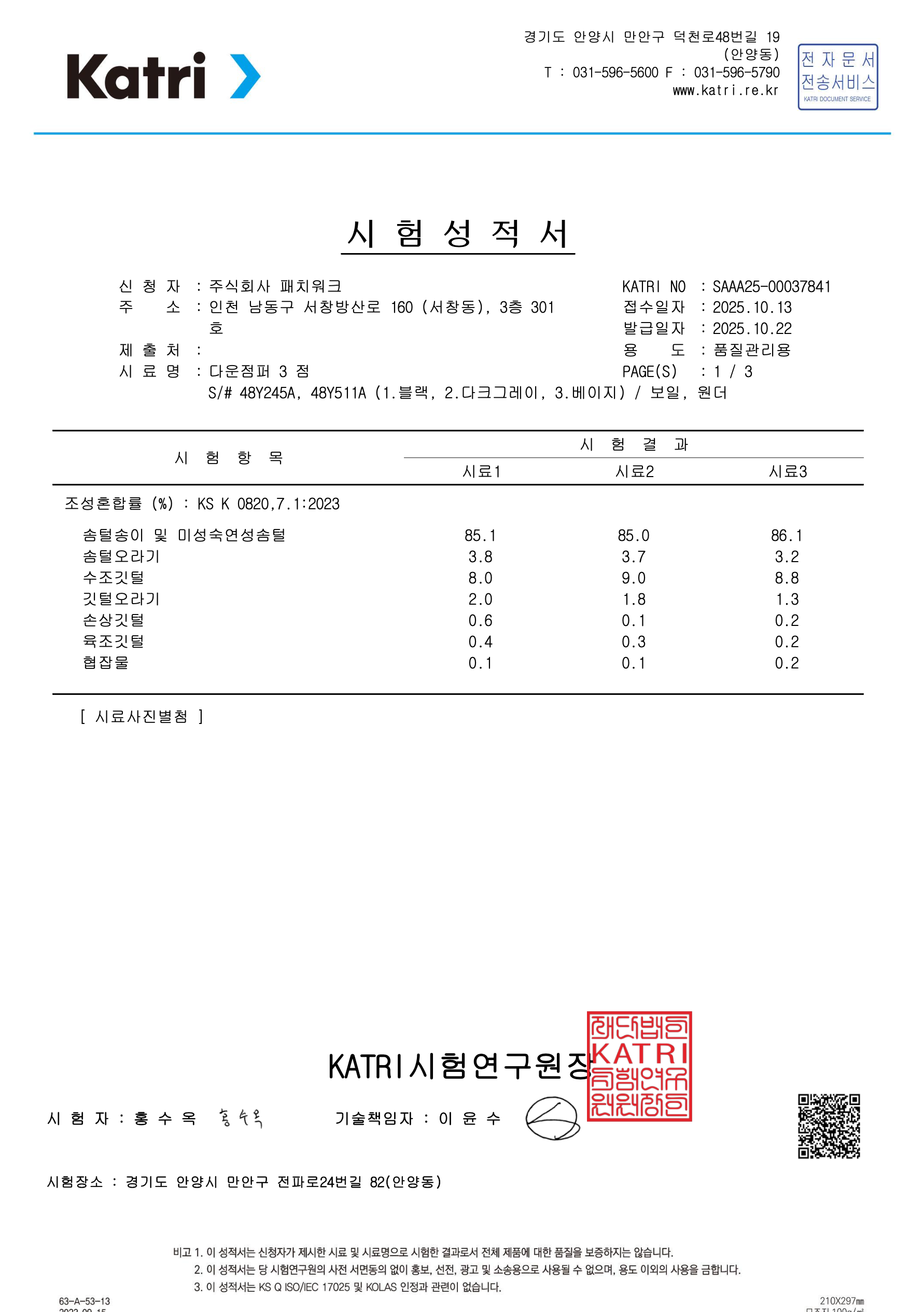 • 덕다운(오리털) 충전재 시험성적서 (한국의류시험연구원 KATRI 발행)