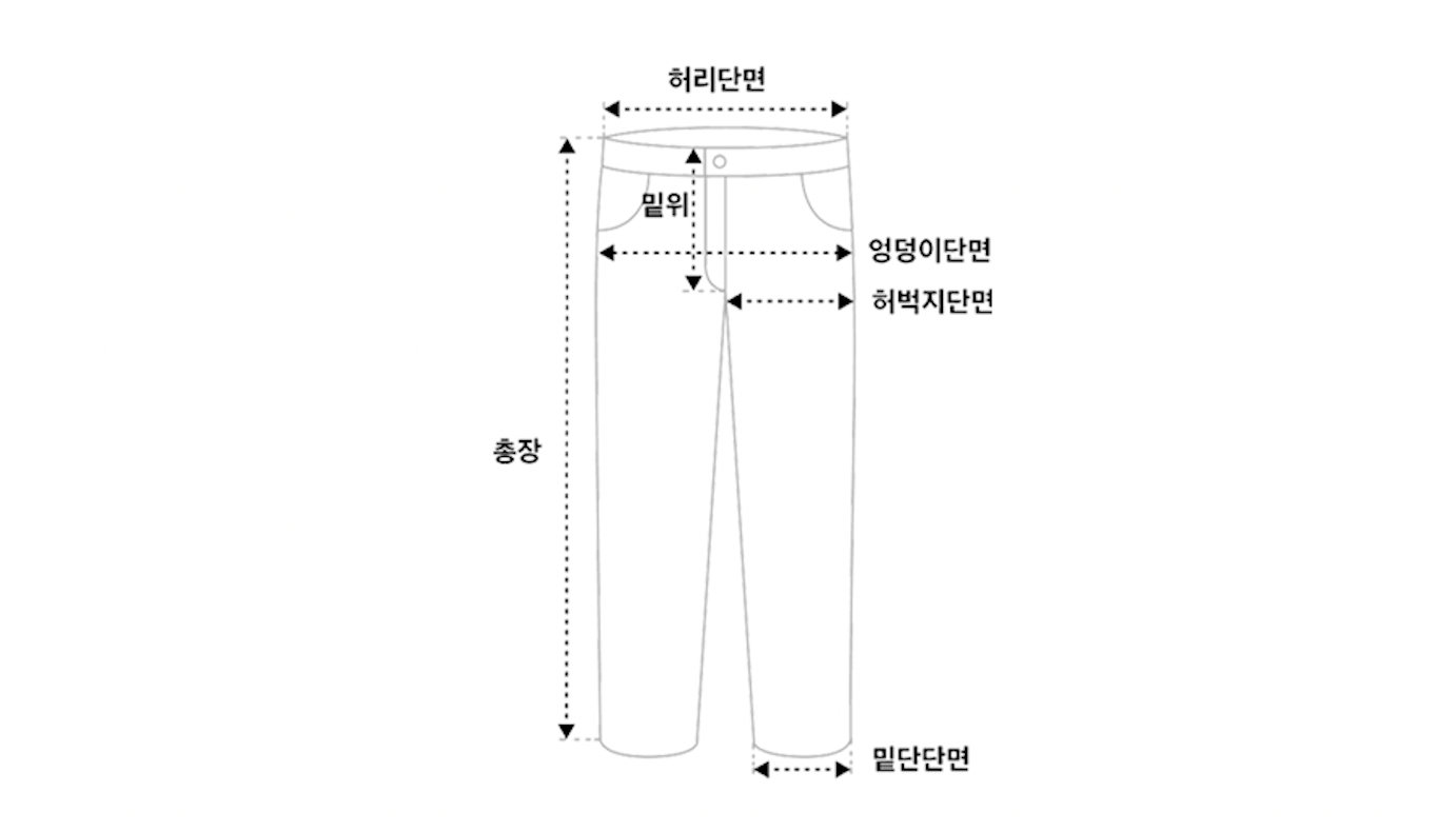| SIZE | 허리 단면 | 엉덩이 단면 | 허벅지 단면 | 밑위 | 밑위 단면 | 총장 |