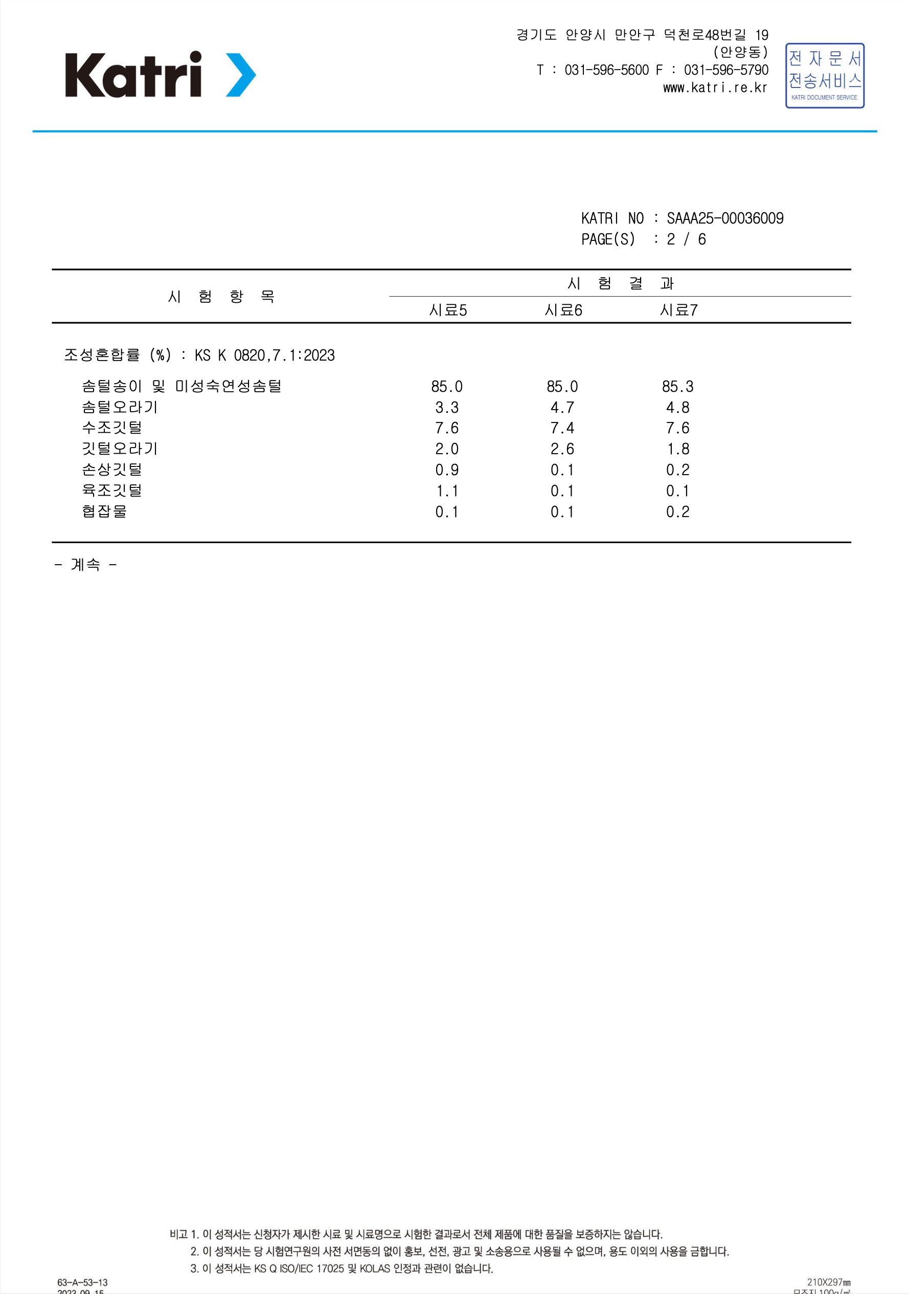 • 덕다운(오리털) 충전재 시험성적서 (한국의류시험연구원 KATRI 발행)