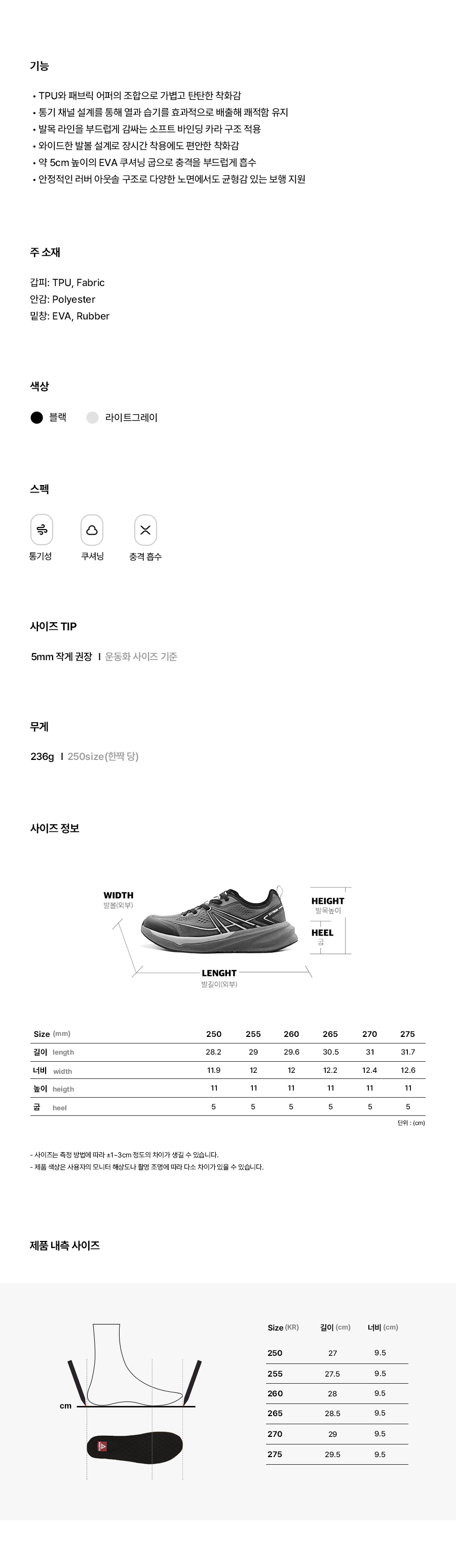 | 무상 보증 기간 | 제품 구매일로부터 1년 (신발 한정) |